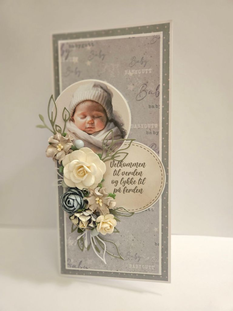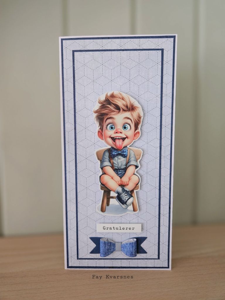 Et helt enkelt barnekort i slimline. Jeg har brukt en dies til sløyfen som jeg har satt sammen. Til tekst og motiv har jeg brukt 3d puter for å fremheve.